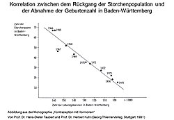 [Bearbeiten | Quelltext bearbeiten]- ↑ R. Matthews: Storks deliver babies (p= 0.008). In: Teaching Statistics. 22(2), 2000, S. 36–38,