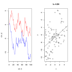 Ein Beispiel in den Anwendungen ist das spurious regression problem der Ökonometrie, auf welches Clive W. J. Granger und Paul Newbold 1974 hingewiesen haben, nach dem auch zwei unabhängige Random walks ohne deterministische Trendkomponente (oder andere Formen von stochastischen Prozessen mit Einheitswurzel) korrelieren, obwohl sogar stochastische Unabhängigkeit vorliegt.[3] Genauer formuliert führen solche durch Autokorrelation verursachte Verletzungen der Voraussetzungen eines Regressionsmodells dazu, dass zum Beispiel die Teststatistiken für die Hypothese, dass der Steigungsparameter der Regressionsgeraden gleich Null ist (t-Statistik), mit wachsendem Datenumfang divergieren, also wenn nur genügend Daten erhoben werden, immer ein Zusammenhang festgestellt wird.