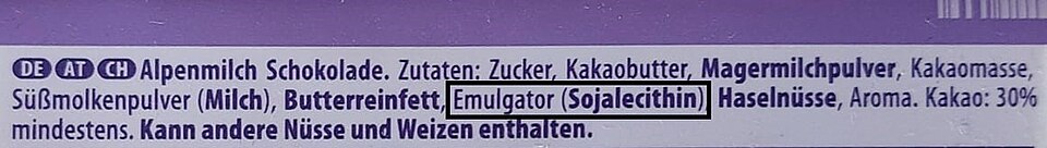 In der Europäischen Union sind die Lebensmittelzusatzstoffe gemäß Anhang II der Verordnung (EG) Nr. 1333/2008 (Stand August 2021[4]) sowie in der Schweiz, gemäß der Zusatzstoffverordnung (ZuV) (Stand: Juli 2020[5]) aufgelistet. Die einzelnen Emulgatoren müssen dabei unter der Sammelbezeichnung Emulgator deklariert werden.[2]