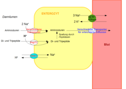 - Di- und Tripeptide werden durch den Transporter PepT1 zusammen mit einem Proton in die Zelle aufgenommen. In der Zelle werden die Di- und Tripeptide überwiegend dann in einzelne Aminosäuren aufgespalten und verlassen die Zelle über erleichterte Diffusion ins Blut. Einige wenige Di- und Tripeptide können auch ungespalten ins Blut gelangen.[42]