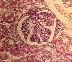 1 Basalmembran; 2 Bowmansche Kapsel, parietales Blatt; 3 Bowmansche Kapsel, viszerales Blatt; 3a Podozytenfüsschen; 3b Podozyt; 4 Lumen der Bowman-Kapsel (Harnraum); 5a Mesangium – intraglomeruläre Mesangiumzellen; 5b Mesangium – extraglomeruläre Mesangiumzellen; 6 Juxtaglomeruläre Zellen; 7 Macula densa; 8 Miozyten (Muskelzellen der Arteriolenwand); 9 Arteriola afferens; 10 glomeruläre Kapillaren; 11 Arteriola efferens