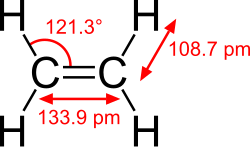 Die H-C-H-Bindungswinkel betragen je 117° und weichen damit nur leicht vom theoretisch idealen Wert der trigonal planaren Form mit 120° ab. Die C=C-Doppelbindung ist mit einer Bindungslänge von 134 Picometern deutlich kürzer als die C-C-Einfachbindung in Ethan mit 154 Picometern.[61]