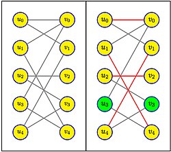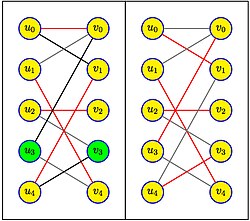 Der Algorithmus von Hopcroft und Karp (1973 von John E. Hopcroft und Richard M. Karp entwickelt) dient in der Graphentheorie zur Bestimmung eines Matchings mit maximaler Kardinalität in einem bipartiten Graphen. Er geht von einem Matching aus, das keine Kanten enthält, und konstruiert dazu alternierende Pfade zwischen noch ungepaarten Knoten. Jeder solche Pfad liefert eine Vergrößerung (Augmentierung) des Matchings um eine Kante.