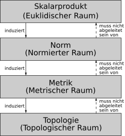 Nach unten und nach rechts nimmt die Spezialisierung der Vektorräume zu. Die in der Tabelle unten stehenden Vektorräume weisen die Eigenschaften der darüberstehenden auf, da ein Skalarprodukt eine Norm induziert