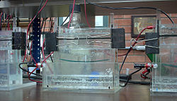 Bei der Gelelektrophorese wandert eine Mischung aus zu trennenden, elektrisch geladenen Molekülen unter Einfluss eines elektrischen Felds durch ein Gel, welches in einer ionischen Pufferlösung (Elektrophoresepuffer) liegt. Je nach Größe und Ladung der Moleküle bewegen sich diese unterschiedlich schnell durch das als Molekularsieb wirkende Gel. Dabei wandern kleine, negativ geladene Moleküle (Anionen) am schnellsten in Richtung der positiv geladenen Anode und positiv geladene Moleküle (Kationen) in Richtung der negativ geladenen Kathode. Die zugrunde liegenden Theorien sind die sich ergänzenden Ogston Siebtheorie und die Reptationstheorie.[1][2][3] Während die Siebtheorie das Zurückhalten (synonym Retention) von sphärischen Makromolekülen (z. B. Proteine oder Micellen) durch eine definierte Porosität der Gelmatrix beschreibt, handelt die Reptationstheorie von einer Retention von Makromolekülen durch Reibung nichtsphärischer Makromoleküle an der Gelmatrix (z. B. DNA und RNA).