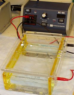 Gelelektrophorese (Wortteile: Gel|elektro|phorese – letzterer abgeleitet von altgriechisch φέρειν pherein ‚tragen‘) ist eine analytische Methode der Chemie und Molekularbiologie, um Gemische verschiedener Arten geladenener Moleküle voneinander zu trennen.